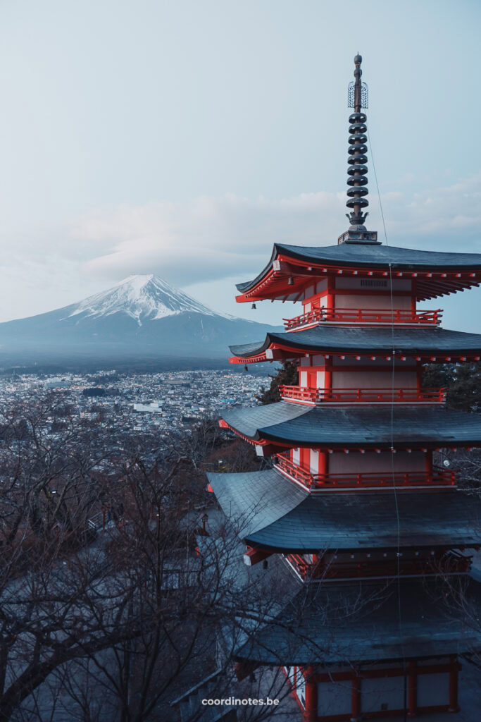 Het uitzicht vanaf de Chureito Pagoda is waarschijnlijk het meest iconische beeld van Mount Fuji dat je ooit zal zien. Die klassieke foto met de pagode op de voorgrond? Die maak je hier. Het is wel een klim van bijna 400 treden, maar het is goed te doen en het uitzicht is het meer dan waard. De vijf verdiepingen tellende pagode met de berg op de achtergrond is ronduit adembenemend, zeker tijdens het kersenbloesemseizoen of wanneer de herfstkleuren op hun mooist zijn.